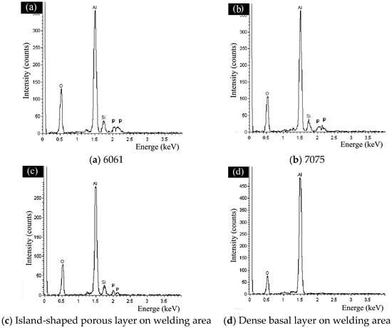 Moreover, EDS analysis in Figure 8a–d indicated that the porous ceramic coating on 6061/7075 and the porous island-shaped layer on welding area had a similar elemental composition; the intensity of elemental composition was similar too. They consisted of Al, O, Si, and P. However, the dense basal layer on the welding area was made up of O and Al, as shown in Figure 8d, and the main composition was inferred as Al2O3. The difference reflected that a time sequence or growth priority existed during the growth process of the overall ceramic coating: the dense basal layer formed first on the surface of base metal, and the porous layer then grew on the dense basal layer [,,].