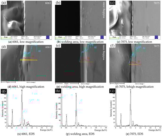 Cross-sectional morphology and EDS analysis of the ceramic coatings on the surface of 6061, 7075 and welding area are shown in Figure 9. The thickness of the coating on 6061, 7075 and welding area was about 5, 4 and 3.5 μm on average, respectively. Clearly, the coating on 6061, 7075 and welding area was integrated firmly with the metal substrate by sintered interlocking. In addition, the difference in thickness proved that the reaction priority or sequence of different areas in 6061–7075 welded part existed during overall plasma oxidation.