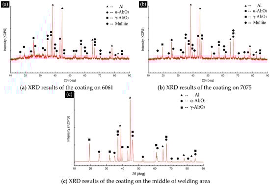 By comparing the XRD results, the components of the porous coating on the surface of 6061 and 7075 were almost the same, i.e., α-Al2O3, γ-Al2O3 and small amount of mullite (3Al2O3-2SiO2). However, the main components of the coating on weld zone (middle position) were α-Al2O3 and γ-Al2O3 since the middle position of welding area was mainly covered by dense basal layer and small amount of distributed island-shaped porous layer, as shown in Figure 5b,e, thus the diffraction peak data obtained were mainly those of the dense basal layer. The XRD results were identical to the EDS analysis results in Figure 8 [].