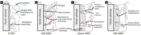 Obviously, the breakdown of dielectric was the key to the growth mechanism of the overall ceramic coating in both the arcing and the breakdown of ceramic coating. Figure 11 shows a diagram of dielectric breakdown process. At 0–50 V low voltage stage (Figure 11a), aluminum substrate reacted with the alkaline electrolyte, a layer of colloidal Al(OH)3 formed on the surface of aluminum substrate, which caused the most primitive colloidal dielectric breakdown behavior. The aluminum substrate started to be oxidized as a result and a layer of amorphous Al2O3 with certain amount of resistance formed gradually. At 100–200 V voltage stage (Figure 11b), the Al2O3 film thickened gradually and the pore structure formed around the discharge channels. Accordingly, the electrical breakdown and the electrolysis of water occurred at the bottom of the holes. When the voltage rose to about 300 V (Figure 11c), the electrolysis of water was extremely intense so that the entire pore was occupied by the produced oxygen (O2). Oxygen bubble was ionized at a voltage drop of about 300 V, and free electrons were generated which triggered the “electronic avalanches” (free electron impact ionization, the number of free electrons was doubled by collisions to 2n, where “n” is the number of collisions) []. Meanwhile, the corona discharge occurred when the oxygen plasma and reactive ions began to form. As a result, the oxide coating on the bottom of the holes broke down and the plasma oxidation entered the spark discharge stage with the ceramic coating thickening rapidly.