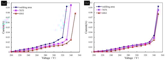 However, it was different for the overall plasma oxidation of the 6061–7075 dissimilar aluminum welded part. Since a chemical/electrochemical activity difference exists between the different areas of dissimilar metal welded part, there is a reaction priority or sequence in the plasma oxidation process. Thus, the breakdown voltage of the solid-state dielectric formed on each area of the welded part was different. To verify the reaction sequence, two breakdown tests were carried out. The first test (a) sampled from an overall plasma oxidation treated welded part with a treating time of 60 s. The second test (b) sampled from untreated welded part. The untreated 6061, 7075 and welding area samples were then plasma oxidation treated for 60 s under the same experimental conditions. The breakdown tests results are shown in Figure 12.