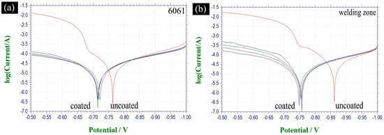Electrochemical polarization curves of the coated/uncoated base metals (6061/7075) and welding area of the 6061–7075 dissimilar aluminum alloys friction stir welded parts are shown in Figure 13. The Ecorr and Icorr were extracted from the potentiodynamic polarization curves via Tafel region extrapolation and the parameters summarized in Table 3. It was clear that the corrosion resistance of 6061/7075 aluminum substrate and welding area were enhanced with the overall plasma oxidation treatment. The Ecorr of 6061 was improved from −0.7665 to −0.7172 V (improved 8.9%), and the Icorr decreased from 4.359 to 2.138 e−5 A/cm2 (decreased 50.9%). The Ecorr of 7075 was improved from −0.7999 to −0.7289 V (improved 8.8%) and the Icorr was decreased from 5.183 to 1.636 e−5 A/cm2 (decreased 68.4%). Similarly, the Ecorr of the welding area was increased to −0.7537 from −0.8633 V (improved 12.7%) and the Icorr was decreased to 1.595 from 4.898 e−5 A/cm2 (decreased 67.4%). All the electrochemical test results showed that the corrosion resistance of each area was improved.