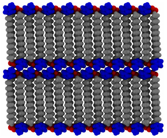 Initial configuration used in our simulation protocol. All of the alkyl tails are parallel, while neighboring molecules as a whole are antiparallel. Each dimension of each layer contains 16 evenly spaced molecules.