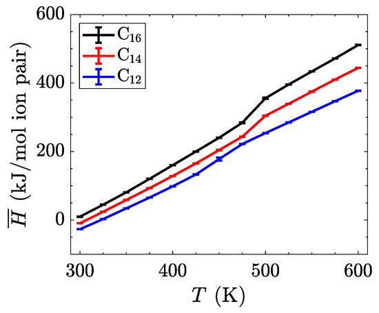 Intrinsic enthalpy as a function of temperature for three different alkyl chain lengths. The phase transitions are less pronounced in this system-wide property, but can be identified by the changes in slope of each line.