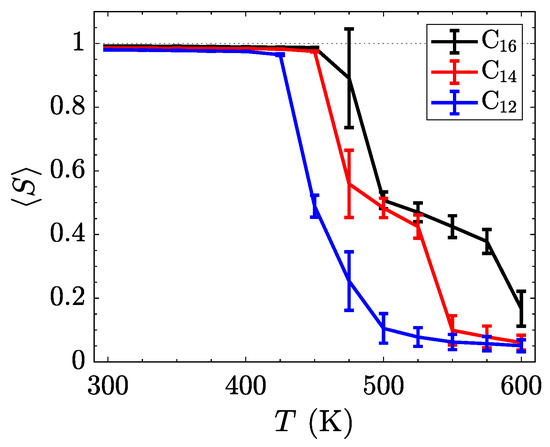 To better understand the ordering of liquid crystalline phases, we compute the orientational order parameter S by defining a nematic director for each molecule from the axis with the smallest moment of inertia, . The Q-tensor [58] was subsequently calculated via Equation (2).