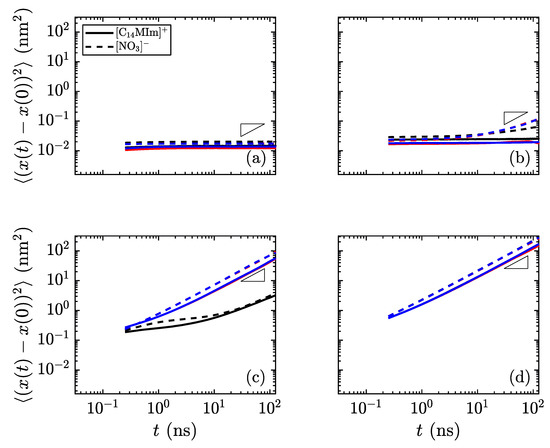Mean-squared displacement of the species in [C14MIm][NO3] as a function of time at temperatures of (a) 400 in the crystalline state, (b) 450 just before the transition to smectic, (c) 500 in the smectic-A phase, and (d) 600 isotropic liquid. Reference slopes of 1, indicated as small triangles, help to identify the linear diffusive regime. The colors signify the dimension (red: x, blue: y, black: z); the solid lines are for the long cations and the dotted lines are for the nitrate anions. The most distinctive difference is the divergence of the z-direction from the x- and y-directions in the smectic-A phase, showing that transport within a layer is much simpler than through the layers. (Notes: (c) The x- and y-directions are nearly overlapping. (d) All directions nearly collapse, indicating an isotropic phase.)
