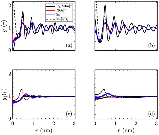 In-plane radial distribution function, of the species in [C14MIm][NO3], trajectory-averaged over the last 200 ns, at temperatures of (a) 400 in the crystalline state, (b) 450 just before the transition to the smectic-A state, (c) 500 in the smectic-A phase, and (d) 600 isotropic liquid. The solid lines signify distribution of a species relative to its own type (black: [C14MIm]+, red: [NO3]−, blue: imidazolyl ring) while the dotted line denotes placement of [NO3]− ions in relation to imidazolyl rings. From (a) to (b), a significant decrease in order of tail groups is observed, with the loss of secondary peaks, while the correlations also decay slightly more quickly as a function of distance. The first phase transition is characterized by the alkyl tails losing almost all order within the -plane. The phase transition to the isotropic liquid loses almost all structure, except for pairing of the opposite charges.