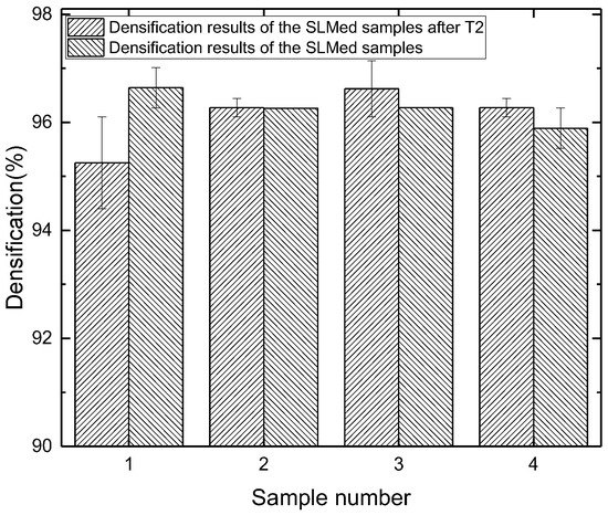 The densifications of the SLMed samples and T2 heat-treated samples are shown in Figure 2. The densifications of all the T2 heat-treated samples are above 95% and the average densification is 96.1%. There is no difference of densification before and after the T2 heat treatment. The result indicates the T2 heat treatment has almost no influence on the densification of the SLMed aluminum alloy samples.