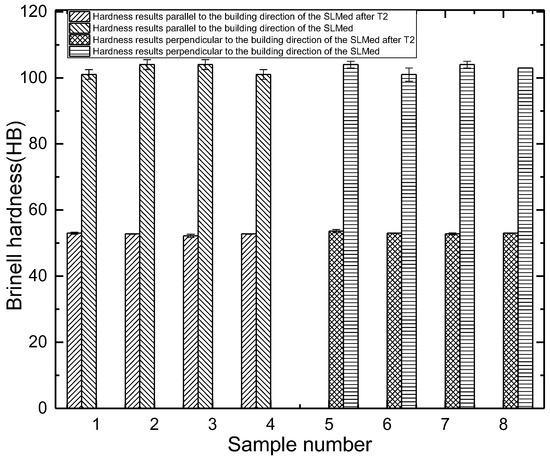 The Brinell hardness results of the samples treated by T2 heat treatment are shown in Figure 3. The average Brinell hardness of the T2 heat-treated samples parallel to the building direction of the SLM is 52.7 HB, and perpendicular to the building direction of the SLM is 53.1 HB. After T2 heat treatment, the Brinell hardness decreases to about 50% of the SLMed samples. In the SLM process, the extremely high cooling rate and temperature gradient leads to great thermal stress in the samples. Correspondingly, residual internal stress is formed in the samples. The existence of residual internal stress greatly improves the ability of samples to resist external load. Therefore, the hardness of the samples decreases significantly after annealing.