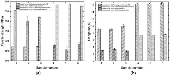Tensile results of the SLMed samples after T2 heat treatment. (a) Tensile strength; (b) Elongation.