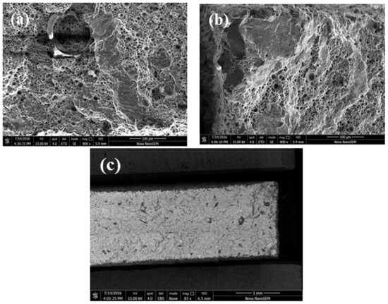 As shown in Figure 6, the island quasi cleavage fracture zone is distributed on the fracture surface of samples after T2 heat treatment, and the fracture morphology shows that the samples are ductile fractured. As shown in Figure 6a, there is an oxide layer around the hole on the fracture surface of samples. As shown in Figure 6b, the quasi cleavage plane is flat because the sample splits along the specific crystal surface. Meanwhile it is also found that non-melted particles are on the fracture, distributed around the cracks. Figure 6c is the backscattering image of the fracture. Compared with the SLMed samples, the dark oxides have a tendency of aggregation distribution, some are spherical distribution, and some are strip distribution. The oxides are banded in the fracture surface of the SLMed samples.