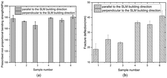 The bending results of the SLMed samples parallel to the building direction of the SLM indicates that the average bending strength is 600 MPa, the prescribed non-proportional bending strength is 345 MPa, and the fracture deflection is 6.5 mm. Perpendicular to the building direction of the SLM, the average bending strength is about 660 MPa, the prescribed non-proportional bending strength is about 365 MPa, and the fracture deflection is 10 mm.