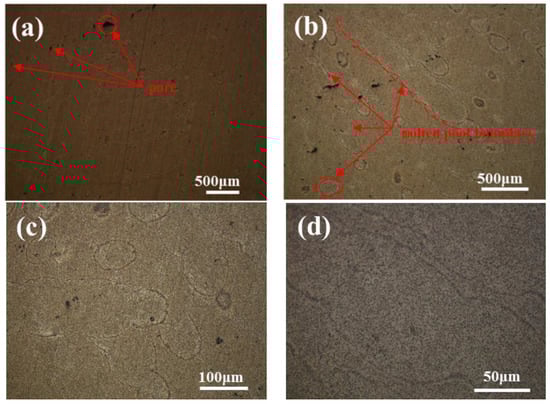 The optical microstructure of the samples perpendicular to the building direction of the SLM after T2 heat treatment is shown in Figure 9. Figure 9a is the overall morphology. The boundary of the molten pool is fuzzy. After corrosion, in Figure 9b,c, it is found that the elliptical area of the precipitate accumulation in the overlapping area of the molten pool is more obvious. After the enlargement, as shown in Figure 9d, the overlapping area of the molten pool is obviously depressed after corrosion. In the overlapping area of the molten pool, a wider precipitate accumulation zone with a width of about 10 μm is found.