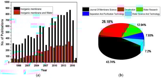 Different types of inorganic membranes have been developed according to the literature. As this area attracts the attention of the researcher worldwide, the number of annual publications returned by the Scopus database, when “inorganic membranes” was used as the keyword, is continuously growing from less than 450 publications in 2000 to double in 2016 as shown in Figure 1a. In addition to that, the publications in the application of inorganic membranes for water treatment and desalination increased from less than 21% in 2000 to about 40% in 2016. It is also worth noting that 40% of publications on the applications of inorganic membranes in water treatment and desalination appear in 5 journals, i.e., Journal of Membrane Science (43%), Desalination (28%), Water Research (12%), Separation and Purification Technology (8) and Water Science and Technology (7.2%).