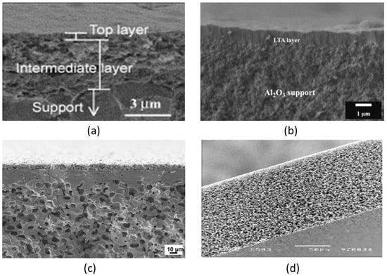 The silica layer is usually placed on the porous ceramic membrane surface as a thin layer using the sol-gel or CVD technique. Examples of some widely reported ceramic layer supports are Vycor glass [] and alumina [,,,].