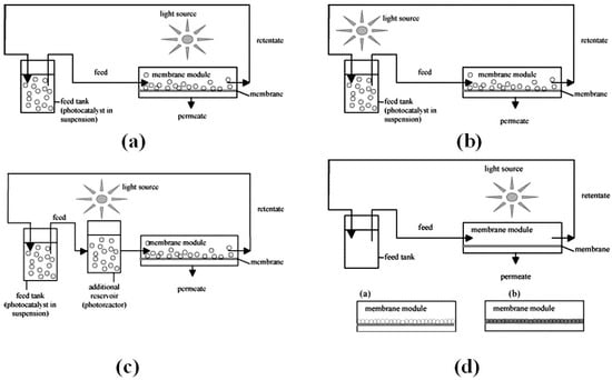 PMR utilizing photocatalyst in suspension with irradiation of the membrane (a); irradiation of the feed tank (b); irradiation of the additional reservoir (photoreactor) located between the feed tank and membrane module (c); and PMR utilizing photocatalyst immobilized on a membrane or within a membrane (d) []. Reproduced with permission from [].