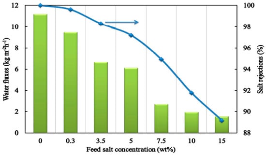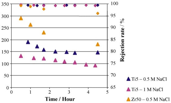 Cerneaux et al. [] compared zirconia and titania ceramic membranes for DCMD application to desalinate aqueous NaCl solution. The salt rejection and flux of the two membranes using two different feed solutions are summarized in Figure 7. It has been reported that the decline in the flux might be due to the driving force decrease by the concentration polarization effect caused by the increasing concentration of salt in the feed mixture during the experiment [,]. Also, the fact that a higher permeate flux was obtained with zirconia may be related to the existence of a lower resistance to water vapor transfer than with titania.