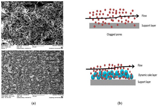 - Al-Malack, M.H. Anderson, G.K. Formation of dynamic membranes with crossflow microfiltration. J. Membr. Sci. 1996, 112, 287–296. [Google Scholar] [CrossRef]
