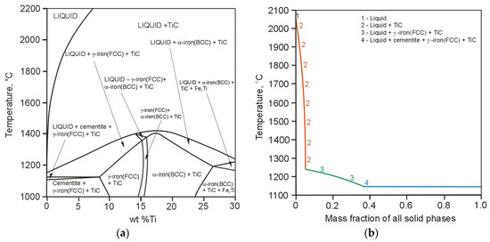 (a) Calculated phase diagram for the quaternary Fe-3.6 wt % C-2.5 wt % Si-Ti alloy system; (b) Scheil solidification path of the Fe-3.6 wt % C-2.5 wt % Si-4 wt % Ti alloy system.