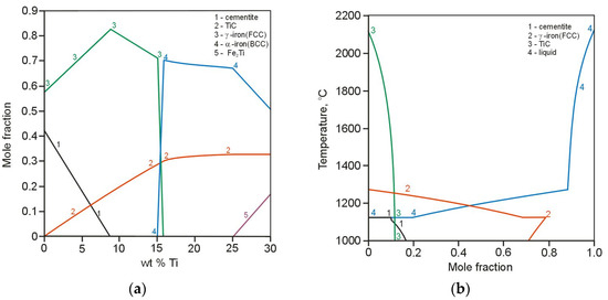 (a) Effect of the amount of titanium in the Fe-3.6 wt %C-2.5 wt % Si-Ti alloy system on the mole fraction of all phases calculated at 1100 °C; (b) thermal stability of the phases in the Fe-3.6 wt % C-2.5 wt % Si-6.0 wt % Ti alloy system.