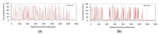 Figure 3 compares the cross-section of the single-pass melted bead with cross-sections of single-pass alloyed beads produced at the same heat input and different powder feed rates (Table 2). It is well known that the mass transport in the molten pool and thereby the resulting concentration profile of the alloying material in the laser alloyed bead is directly influenced by the intensity and pattern of the fluid flow (Marangoni convection) in the molten pool [27]. The shape of these fusion zones suggests that during both the LSM and LSA processes the surface tension temperature coefficient on the molten pool surface was positive, i.e., the surface tension was highest at the centre of the molten pool and produced fluid flow inward along the surface of the molten pool. In general, this pattern of the fluid flow results in a formation of the hemispherical molten pool. As the laser power increases, the convection becomes much faster, leading to the narrower and deeper molten pool [28]. As can be seen in Figure 3a, during the LSM process the above-mentioned heat and mass transfer mechanism was dominant. However, in the case of the LSA process, it can be concluded that the addition of titanium into the molten pool led to the decrease in the intensity of the convection. This suggestion is supported by measurements of geometrical parameters of the fusion zone, summarised in Table 2. With the increase of the titanium concentration in the molten pool, under a constant laser power and a traverse speed, the depth of the fusion zone decreased and the bead profile became more hemispherical in shape. Simultaneously, the cross-sectional area of the bead was markedly reduced. It should be emphasized that the TiC particles are the result of an exothermic reaction between liquid titanium and carbon in the molten pool. Consequently, the higher fraction of TiC particles, associated with the higher titanium content, indicates a larger amount of the heat generated directly in the molten pool, what should bring about the larger fusion zone area. Based on the above, it is reasonable to conclude that the convective heat transfer in the molten pool becomes gradually reduced with the increasing TiC fraction. The resultant reduction in the mass transport in the molten pool (throughout the fusion zone) is reflected on Ti concentration profiles on the cross-section of single-pass alloyed beads, presented in Figure 4. These results are in agreement with those of Yuan et al. [29]. They formed TiC-reinforced layers on a Ti6Al4V substrate using LSA and stated that the convection in the molten pool is the main factor controlling the fraction of TiC particles and their distribution throughout the alloyed region.