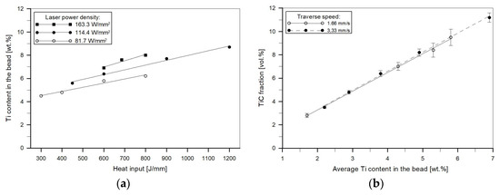 (a) Effect of the heat input level and laser power density on the maximum titanium content in the uniformly alloyed bead; (b) effect of the titanium concentration in the molten pool and traverse speed (at constant heat input of 600 J/mm) on the TiC volume fraction.