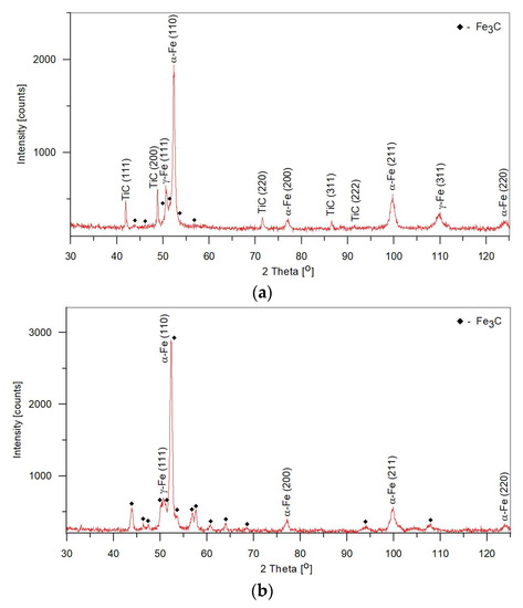 Microstructural parameters of the TRLs produced under different processing conditions, based on a quantitative analysis of micrographs and XRD patterns, are presented in Table 3. Representative XRD patterns for the TRL no. 3, containing the highest TiC fraction (~15.4 vol %) and the SML produced at the same heat input are depicted in Figure 9a,b, respectively. Fractions of cementite and retained austenite in the above SML were measured to be 53 ± 2.5 vol % and 3.9 ± 0.8 wt %, respectively. As the thermodynamic calculations predicted, in the case of the TRLs, with increasing titanium content, at the same heat input and traverse speed, the fraction of cementite gradually decreased as a consequence of the increasing fraction of TiC phase. However, the data presented in Table 3 imply that simultaneously the fraction of the retained austenite was raised. Moreover, the increase in the traverse speed, at the constant heat input level (by adjusting laser power) and powder feed rate, results in a marked increase in the amount of retained austenite. At the heat input of 600 J/mm, the amount of retained austenite in the TRLs having the same titanium content of about 7.5 wt % was measured to be 20.7 ± 0.9 wt % and 30.9 ± 1.2 wt % for the traverse speed of 1.66 and 3.33 mm/s, respectively. At the same time, fractions of the TiC and the cementite, for both TRLs, remained unchanged at about 14 and 19 vol %, respectively. The variation in the fraction of retained austenite can be attributed to a change in carbon content in the primary austenite grains caused by different cooling rates. Faster cooling rates increase the carbon content in the austenite, what suppresses the martensitic transformation [31]. Therefore, lower traverse speeds and the resulting lower solidification and cooling rates, are favourable for providing higher fractions of the martensite in the matrix of the composite layers presently being considered. This, in turn, will provide better support of the TiC reinforcing particles during sliding wear.