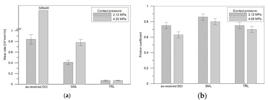 Comparisons of (a) wear rates and (b) the friction coefficient for the as-received DCI, SML and TRL tested at different normal pressures. The error bar indicates the variations from the mean value due to duplicated tests.