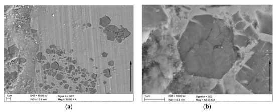 The morphology of the worn surfaces of the TRL is presented in Figure 12, Figure 13 and Figure 14. As can be seen, the presence of the tribo-layer, resulting from a material transfer from the counterface to the surface of the TRL, is evident at the two applied contact pressures. Backscattered electron images in Figure 12, where brighter contrast corresponds to a higher average atomic number, clearly indicate that the amount of the transferred material remarkably increased with the contact pressure. As a result, at higher contact pressure, the tribo-layer covers a significant portion of the wear track, creating a third-body contact.