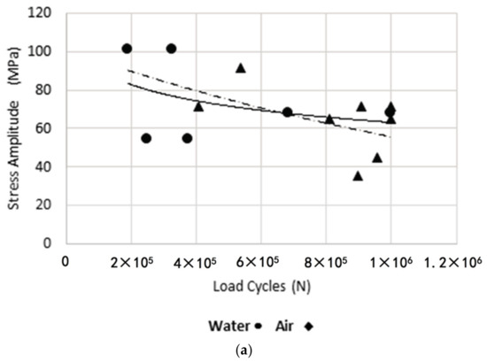 Diagrams Stress—Number of Cycles. (a) For water and air; (b) For a weld size leg 3 mm and 5 mm; (c) For a load ratios 0 and –0.5.