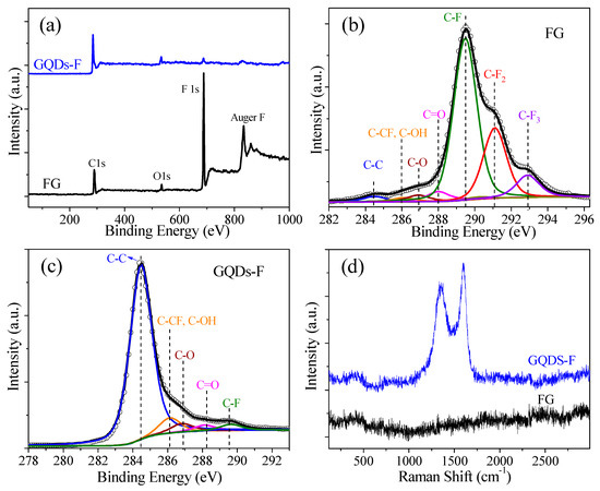 (a) The survey X-ray photoelectron spectra (XPS) spectra of FG and GQDs-F samples; (b) The C 1s XPS of FG, which were fine-scanned and deconvoluted into several components; (c) The C 1s XPS of GQDs-F, which were fine-scanned and deconvoluted into several components; (d) The Raman spectra of FG and GQDs-F.