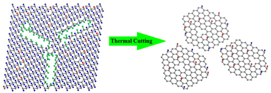 While fully fluorinated graphene with perfect sturcture is quite stable [28,29], the presence of atomic defects in the fluorinated graphene sheet leads to an obvious lowering of the melting temperature [29]. According to the above XPS analysis, we give the schematic models in Figure 3 to better understand the mechanism for the thermal cutting of FG into GQDs-F. Because of the non-negligible formation of CFn (n = 2, 3) in FG, it can be deduced that FG is highly fluorinated graphene with a great number of structure defects (shown in the left of Figure 4). In the annealing of FG, the rupture is not only for C-F bonds, while at the lattice defects of the graphene sheet, the C–C bond is much weaker in CF–CFn (n = 2, 3) structure and is easier to be broken, leading to the evaporation of CFn fragments [30,31]. At the same time, many F-atoms break the original local bonds in the annealing. Instead of being detached from the graphene, they transfer to the edges of the structure defects and then detach from the sheet with the bonded C atoms [29]. That is, the presence of these structure defects makes the FG fragile and readily attacked. Like scissors, the CFn (n = 2, 3) groups near carbon vacancy defects lead to the loss of around skelton C atoms in annealing, and greatly enlarge the structure defects of FG. When the annealing temperature is high enough (>780 K), FG can be completely cut into scattered graphene quantum dots (shown in the right of Figure 4). Because of the high stability of fluorine atoms at graphene defective sites and edges [35], remanent fluorine adatoms should be mostly like to bond at the edges of GQDs-F. Otherwise, the residual oxygen containing groups may locate at the edge or the basal planes. We have also undertaken the thermal annealing at 680 K, and explore the defect forming at a low annealing temperature (Figure S2, Supplementary Materials). It is found in Figure S2 that FG did not decompose into grahene nanodots when annealed at 680 K, and the sample FG-680 maintain the two-dimensional flexible structure because of only part of CFn groups of FG detached from graphene skeleton. Such novel synthesis of GQDs-F is highly effective and convenient. The weight of GQDs-F is 13.2 wt % weight of the raw materials FG, indicating that it is a high-yield approach.