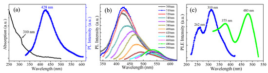 (a) The left curve is UV-vis absorption of the GQDs-F sample dispersed in water. The right curve is the emission spectrum of GQDs-F under 310 nm excitation. (b) The PL spectra of the GQDs-F at different excitation wavelengths. (c) The PLE spectrum of the GQDs-F with the detection wavelength of 428 nm (the blue curve) and 533 nm (the green curve).