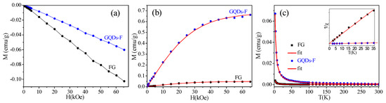 Subsequently, we carried out the magnetic measurements for FG and GQDs-F. It is found that only linear diamagnetism is observed in the samples at 300 K (Figure 5a). Figure 5b gives the dependence of magnetization M (after deducting the corresponding diamagnetic characteristic) on applied field H at 2 K. The M(H) curves of FG and GQDs-F fit well with the Brillouin function [17,18]
