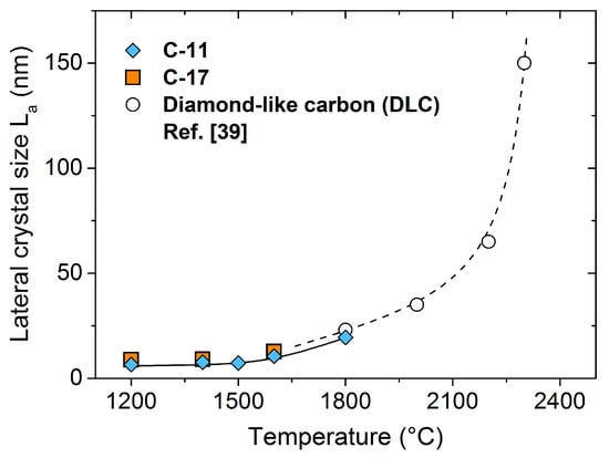 The graphitization of diamond-like carbon within the temperature range of 1800–2700 °C has been investigated by Cançado et al. []. The lateral crystal size strongly increases from ≈20 nm (1800 °C) to ≈500 nm (2700 °C). As shown in Figure 2, the La values for C-11 and C-17, typically about 10 nm within 1200 < T < 1600 °C, join at the onset of graphite formation, further supporting the assignment to nano-crystalline carbon.