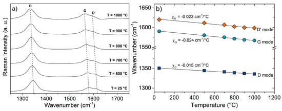 It is well known that the temperature dependence of the phonon dispersion curves of carbon materials is a direct consequence of anharmonic contributions to the lattice potential []. According to the molecular dynamics simulation (MD) of Koukaras et al., each of the inserted potentials produces a good description of some phonon branches but none works for all of the optical and acoustical branches of graphene [,]. However, the modified Tersoff potential [] correctly describes the temperature dependence of the E2g mode (Raman G band). A linear down-shift of the G line or softening of the E2g mode, respectively, is predicted within the temperature range investigated (−200 to 1200 °C). Since the G band is associated with the in-plane vibration in sp2 carbon, the shift with temperature should be similar for the various carbon materials, i.e., we expect a linear dependence for carbon enclosed in the SiOC matrix with a temperature coefficient χG of about −0.02 cm−1/°C, as experimentally observed in graphene [,] HOPG [] and SWNTs [,,] at low temperatures (T < 600 °C).