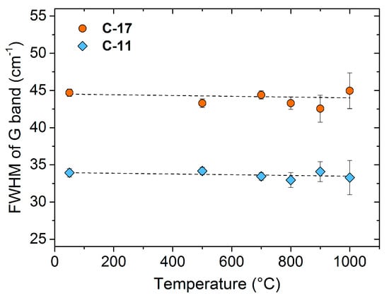 Apart from the G shift, information about the phonon properties can be obtained from the width of the G line. Figure 4 shows the temperature dependence of the G-line width of C-11 and C-17. The full width at half maximum (FWHM) of both samples is temperature independent, with values of 35 cm−1 and 45 cm−1. The error bars indicate the standard deviation of the FWHM values. Due to thermal radiation, the error significantly increases with temperature. Theoretical data for graphite and graphene yield a FWHM of ≈12 cm−1, which decreases with increasing temperature above T > 25 °C due to phonon-phonon interaction []. Experimental data for HOPG provide a FWHM of ≈15 cm−1 independent of temperature (up to ≈700 °C), [] suggesting that the phonon-phonon interaction is compensated by phonon-electron interactions (which typically increase with temperature) []. In comparison to these well-ordered carbon materials, the significantly larger FWHM of nano-crystalline C-11 and C-17 cannot be solely explained by phonon-phonon and phonon-electron interactions; scattering with defects and impurities most likely determines the line width of the G band in these less-ordered materials.