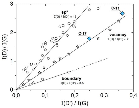 Information about the type of defects in carbon can be derived from the intensity ratios of the D, D’ and G bands. A systematic study of the defects in graphene and graphite has been performed by Eckmann et al. []. By plotting the intensity ratio ID/IG versus ID’/IG, different types of defects can be distinguished by the respective slopes (sp3: ≈13, vacancies: ≈7 and boundaries: ≈3.5). Figure 5 compares C-11 and C-17 with graphite and modified graphene. C-11 and C-17 fit into the ID/IG versus ID’/IG—dependency observed for vacancies, suggesting that this type of defect dominates the phonon characteristics of nano-crystalline carbon in the silicon oxycarbide ceramics.
