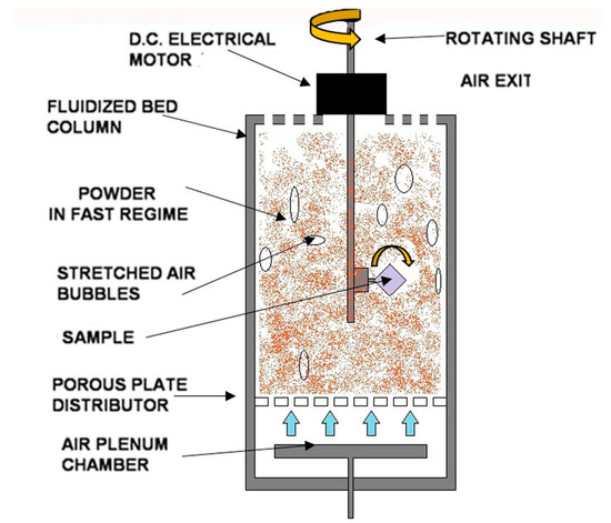The FB device is a cylindrical column with a section of 6936 mm2. A porous bronze plate, the function of which is to homogeneously distribute the flowing air, is placed on the bottom. The pores have a size of 30 µm in order to support the alumina powder when the air is not flowing. Above the porous plate, there is the fluidization column. When the gas is flowing, the particles are suspended in the flow, behaving like a fluid.