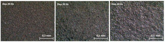 Stereoscopic images of the samples reported in Figure 2 show that the substrates coated at 20 and 30 Hz feature a homogeneous deposition. In contrast, the sample produced at 40 Hz is characterized by an indented surface with tiny uncovered spots, as illustrated by the clearer dots on the sample surface.