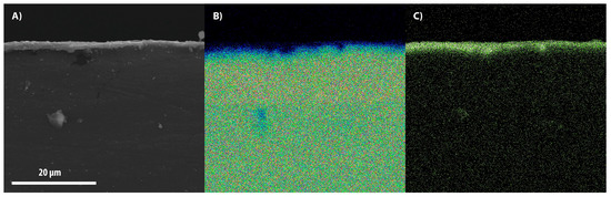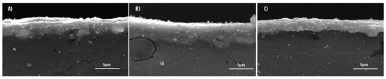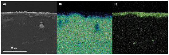 Figure 3, Figure 4 and Figure 5 show the SEM images of the cross-section between the substrates and coatings in panel A, while panels B and C depict the maps of the distribution of magnesium and aluminum contents, respectively. In Figure 6, the coatings are reported with an increased magnification.