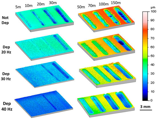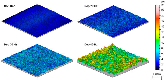 The 3D maps obtained and reported in Figure 8 confirm how the irregularity of the morphology grows with the deposition frequency.