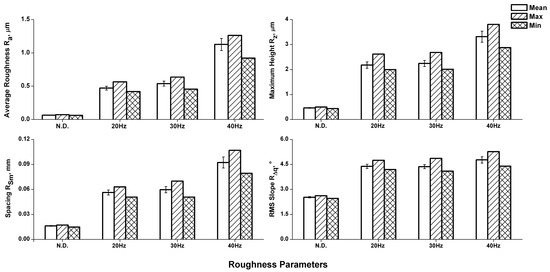 The roughness analysis, which results are reported in Figure 9, allowed the evaluation of the following parameters: average roughness, maximum height, spacing, and RMS (root mean square) slope.