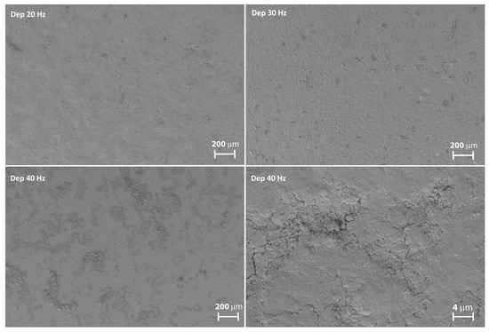 From the SEM images in Figure 10, is deducible that, for the coatings formed at 20 and 30 Hz, homogenous deposition was achieved, while for that formed at 40 Hz there are visible damaged areas. In particular, high frequencies allow the alumina deposition, while extended process time results in the brittle expulsion of material from the plating.