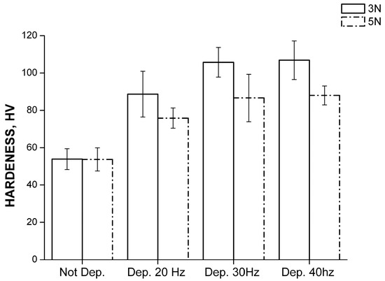 The mechanical behavior of the films was then tested. The first investigation implemented was the micro-hardness test. The variables considered during the test were the deposition frequency and the indenter load. The results are shown in Figure 11.