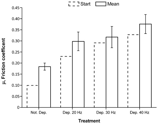 The friction coefficient was then analyzed and the results are reported in Figure 15. As expected in consequence of the roughness results, the samples coated at 20 and 30 Hz present similar results of the friction coefficient, while that coated at 40 Hz shows an increase due to the coating removal and the formation of ditches.