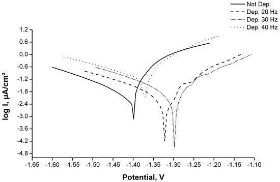 Considering the corrosion potential, the best results were obtained for the samples coated at 20 and 30 Hz, with similar results. Although the sample with the coating deposited at 40 Hz also showed a shift of this parameter to a nobler value, this behavior was less significant that of the specimens treated at 20 and 30 Hz. The same trend was observed for the corrosion current, but while the deposition at 20 and 30 Hz led to an improvement of the current density, the sample plated at 40 Hz was found be worse than the untreated sample.