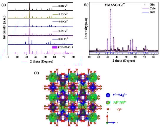 - Pan, Z.F.; Li, W.Q.; Xu, Y.; Hu, Q.S.; Zheng, Y.F. Structure and redshift of Ce3+ emission in anisotropically expanded garnet phosphor MgY2Al4SiO12:Ce3+. RSC Adv. 2016, 6, 20458–20466. [Google Scholar] [CrossRef]