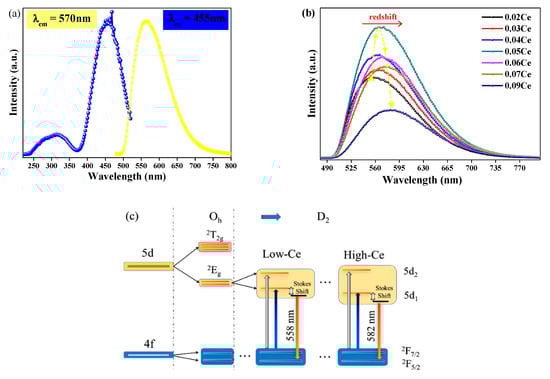 - Wang, B.; Lin, H.; Yu, Y.L.; Chen, D.Q.; Zhang, R.; Xu, J.; Wang, Y.S. Ce3+/Pr3+:YAGG:along persistent phosphor activated by blue-light. J. Am. Ceram. Soc. 2014, 97, 2539–2545. [Google Scholar] [CrossRef]