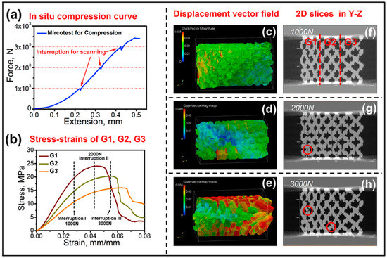 The first in situ experiment was a uniaxial compression test on the specimens with a dimension of 15 × 30 × 30 mm3 at a displacement rate of 1 × 10−3 mm/s [101]. The loading direction was perpendicular to the graded direction. The test was stopped at 1000 N, and the specimen was scanned using XRT. Then, the specimen was continually loaded to 2000 N. Such an interruption scanning was adopted at 1000 N, 2000 N, and 3000 N, respectively, in Figure 1a. The digital volume correlations (DVC) technique running on Davis platform offered by LaVision (LaVision GmbH, Göttingen, Germany) was used to analyze the displacement and strain field of the graded meshes based on the XRT results [101]. The color in Figure 1c–e represents the glyph vector magnitude in ParaView software. The 2D XRT slices in Figure 1f–h were used to track the sites of cracks generated at 1000 N, 2000 N, and 3000 N, respectively. The results indicated that the G1 mesh endured a process of the highest stress (Figure 1b), the highest strain (Figure 1c), cracks formed (Figure 1g), and the modulus decreased. Then, the G2 mesh successively exhibited a similar process followed by the G3 mesh. Under compressive load, such a non-uniform deformation behavior in the entire meshes originated from the graded mechanical properties of the G1, G2, and G3 meshes. The G1 part had the highest modulus and strength, so it could support the highest stress. Once cracks nucleated in the G1 part, the redistribution of the stress occurred. While many studies captured the outer or surface deformation features of graded meshes during compression test by a camera or scanning electron microscopy [102,103], the results here showed the interior deformation characteristics of graded meshes during compression by in situ XRT. This internal information gave new insights into how the substructure of graded meshes deformed and the crack nucleated in microscale while the entire sample was under elastic deformation in macroscale.